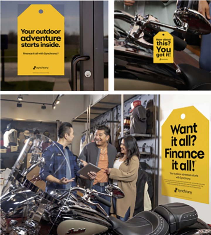 When shoppers walk into a powersports dealer ready to buy, they’re looking for “permission” to get all the accessories they want to go with their vehicle. Imagine a dealership filled with Synchrony-branded tags announcing your ability to finance it all — used and new — with a single loan. This was my concept from the start and the client loved it.